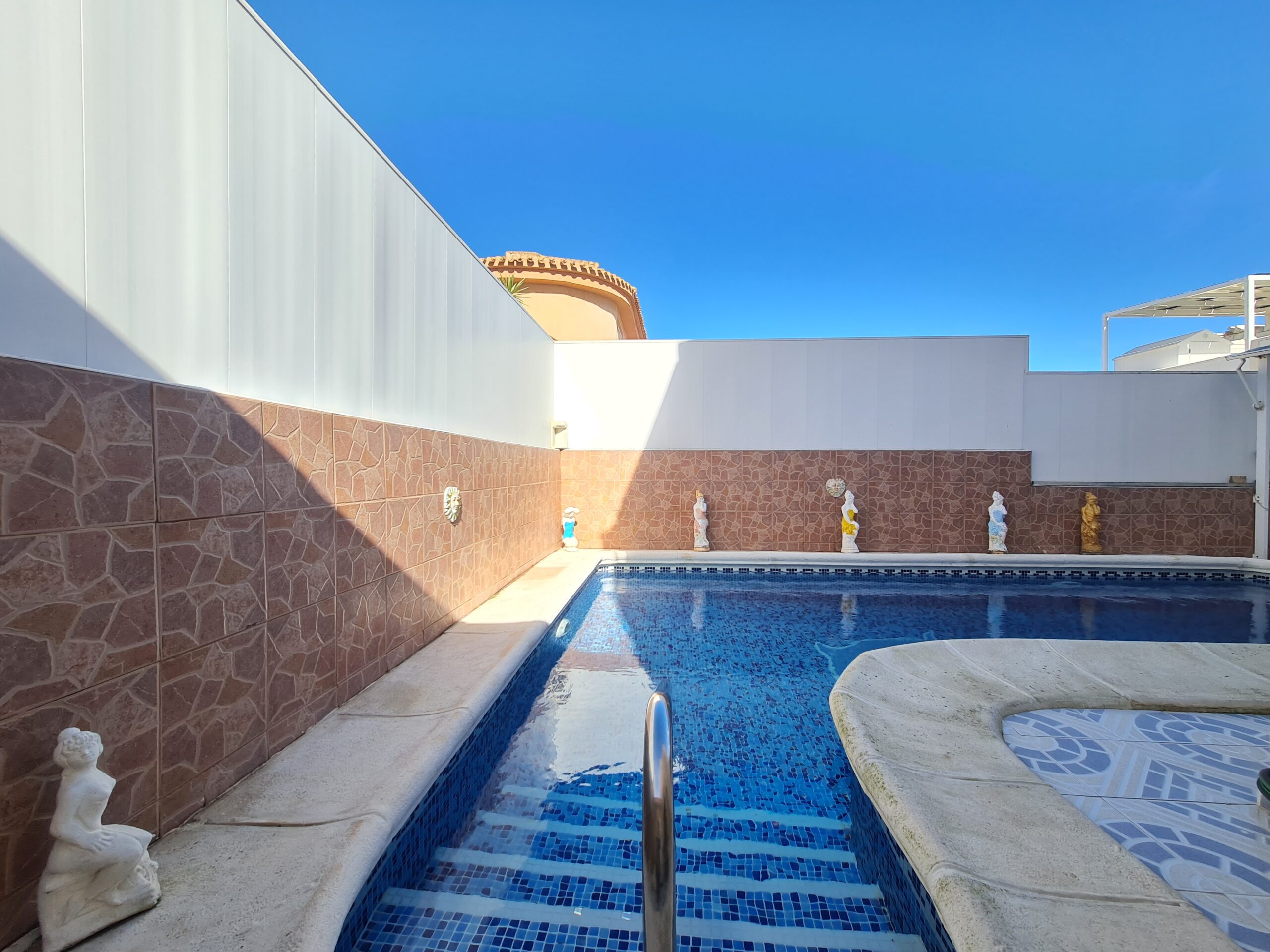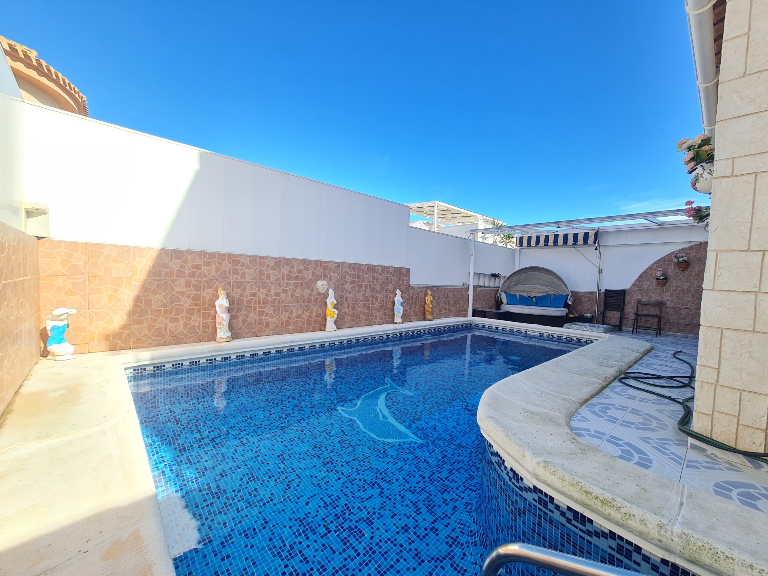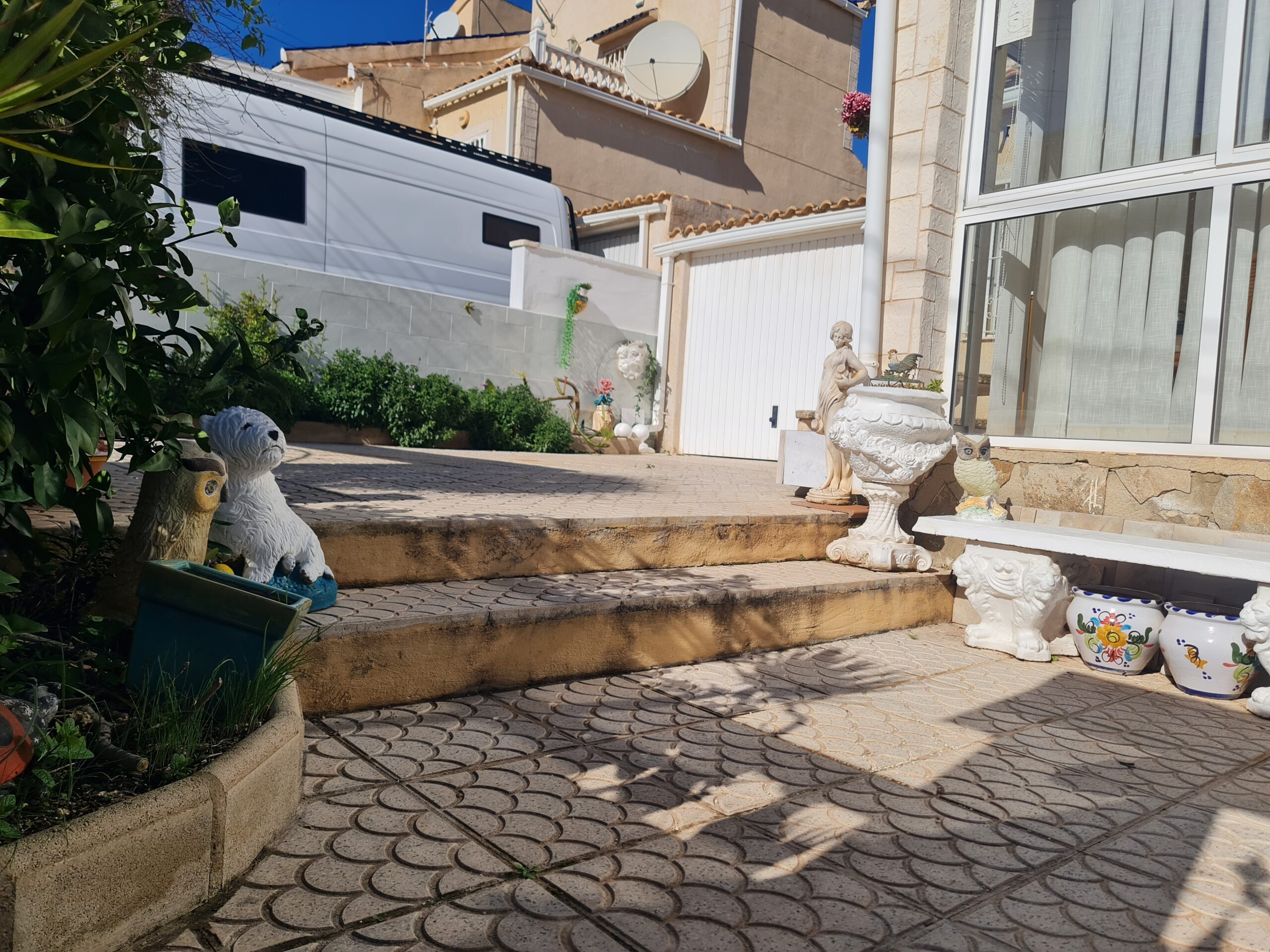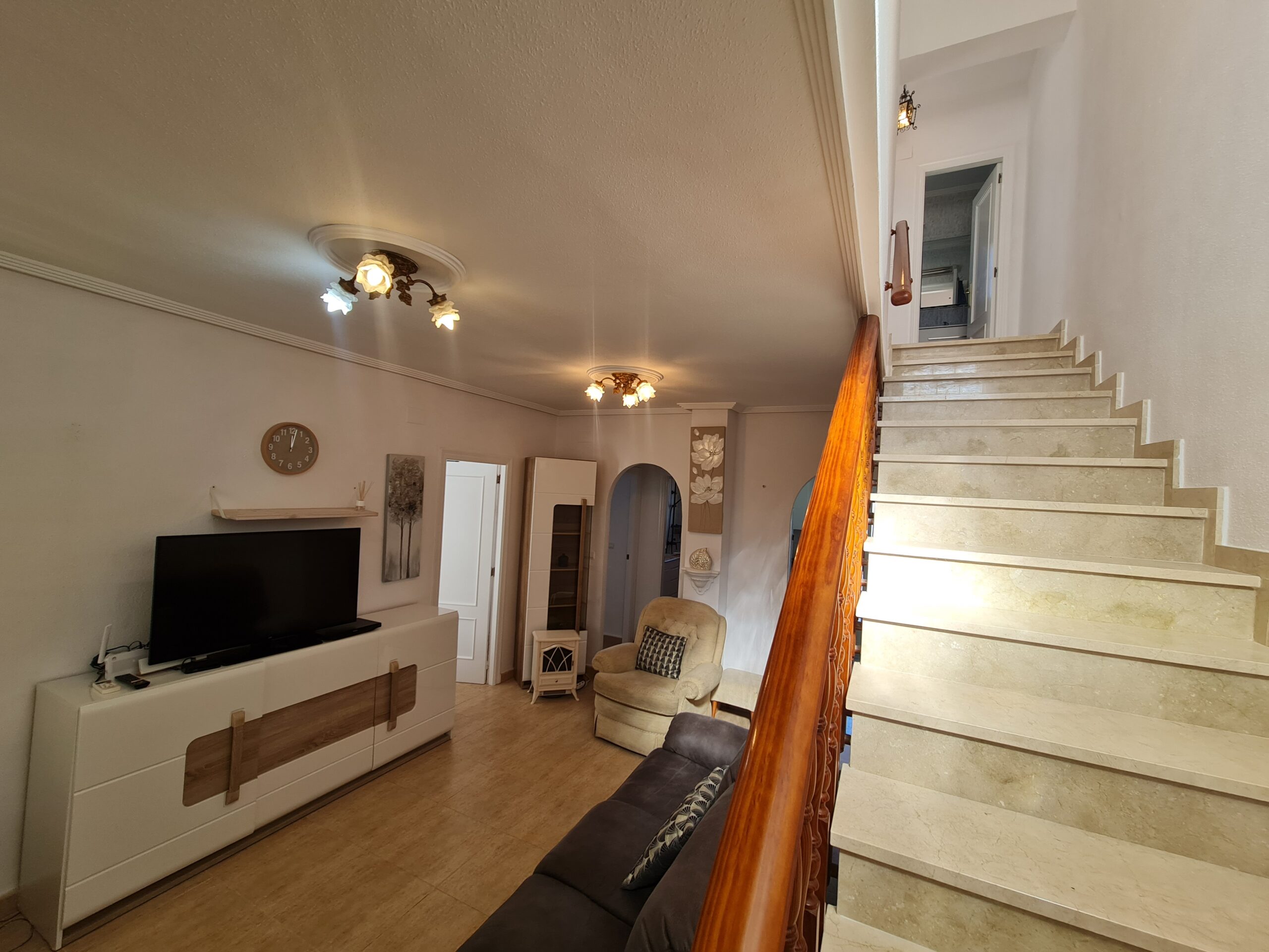 - Spectacular house with large outside space , private garage, private pool. House offer 2 bedrooms , 1 bathroom , living room and separate kitchen downstairs and 1 bedroom 1 bathroom upstairs. With a sunny terrace with a little sea views. La Fuente commercial center its not even 5 min drive. Also golf courses are just around the corner. Alicante airport 45 min drive. Sandy Beach only 6-7 min drive.: