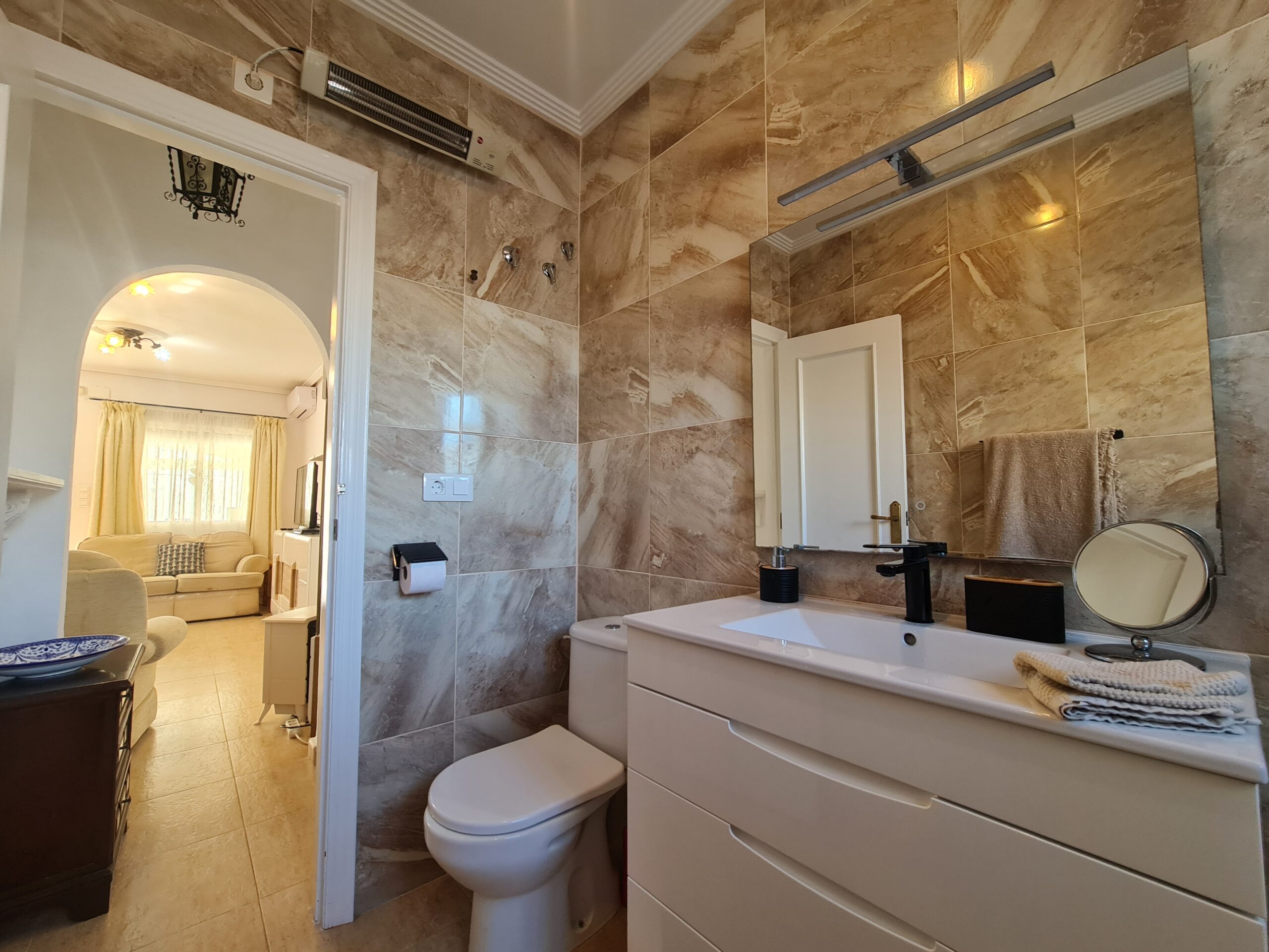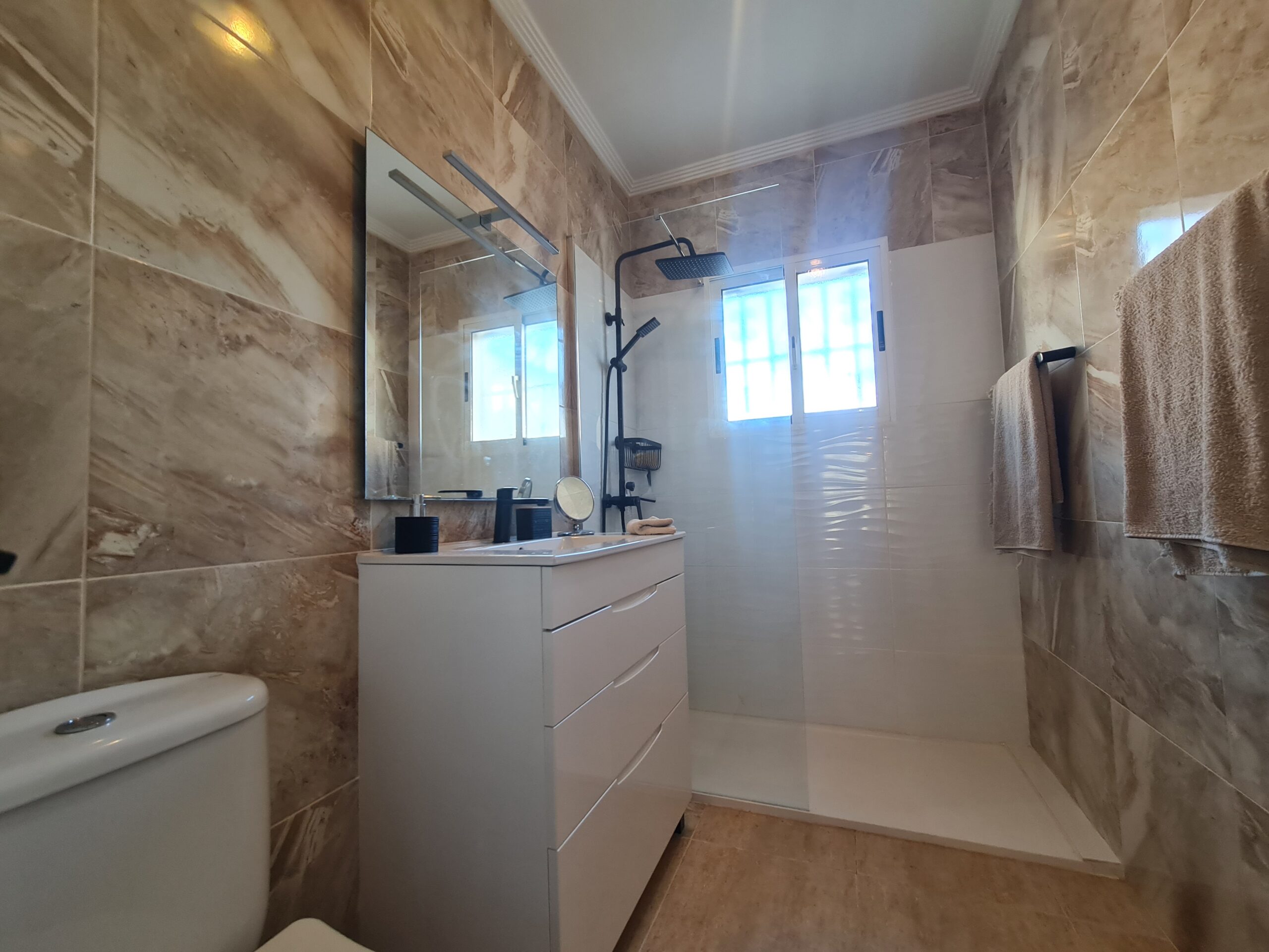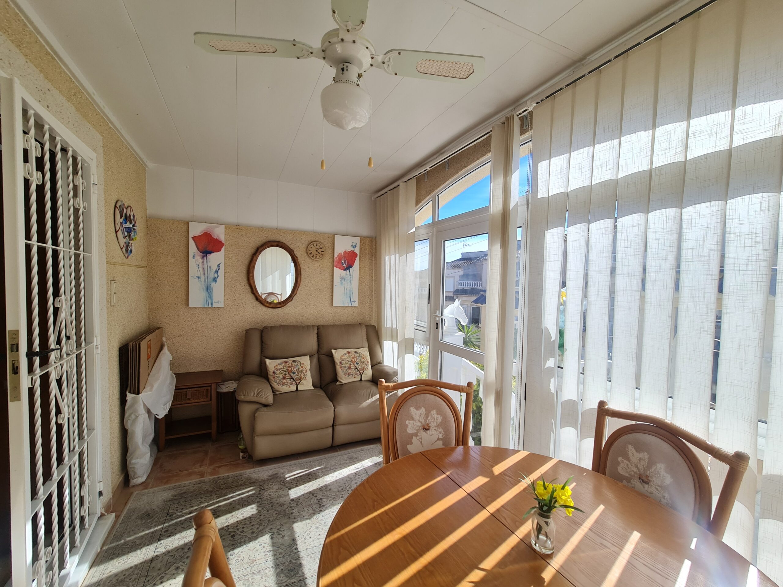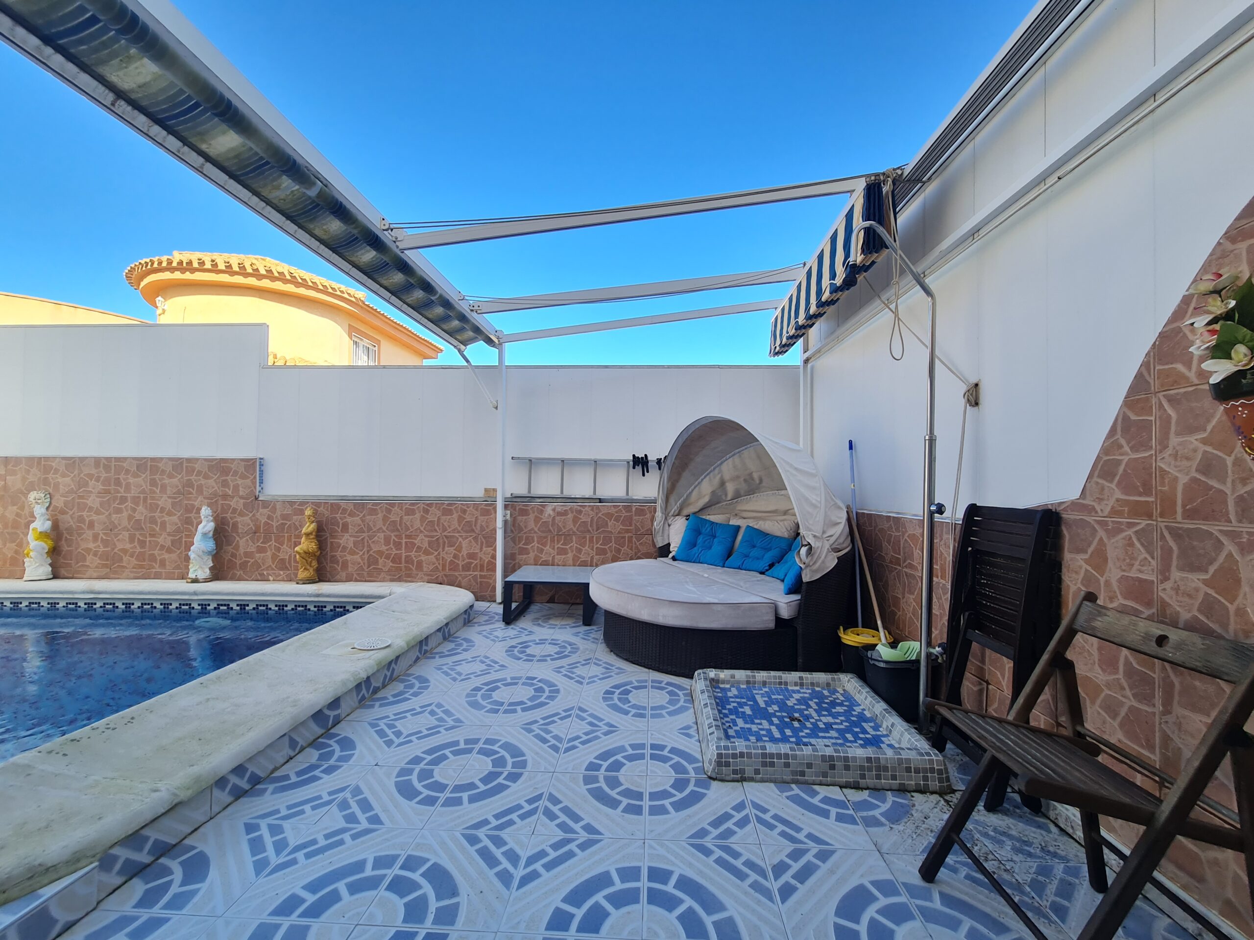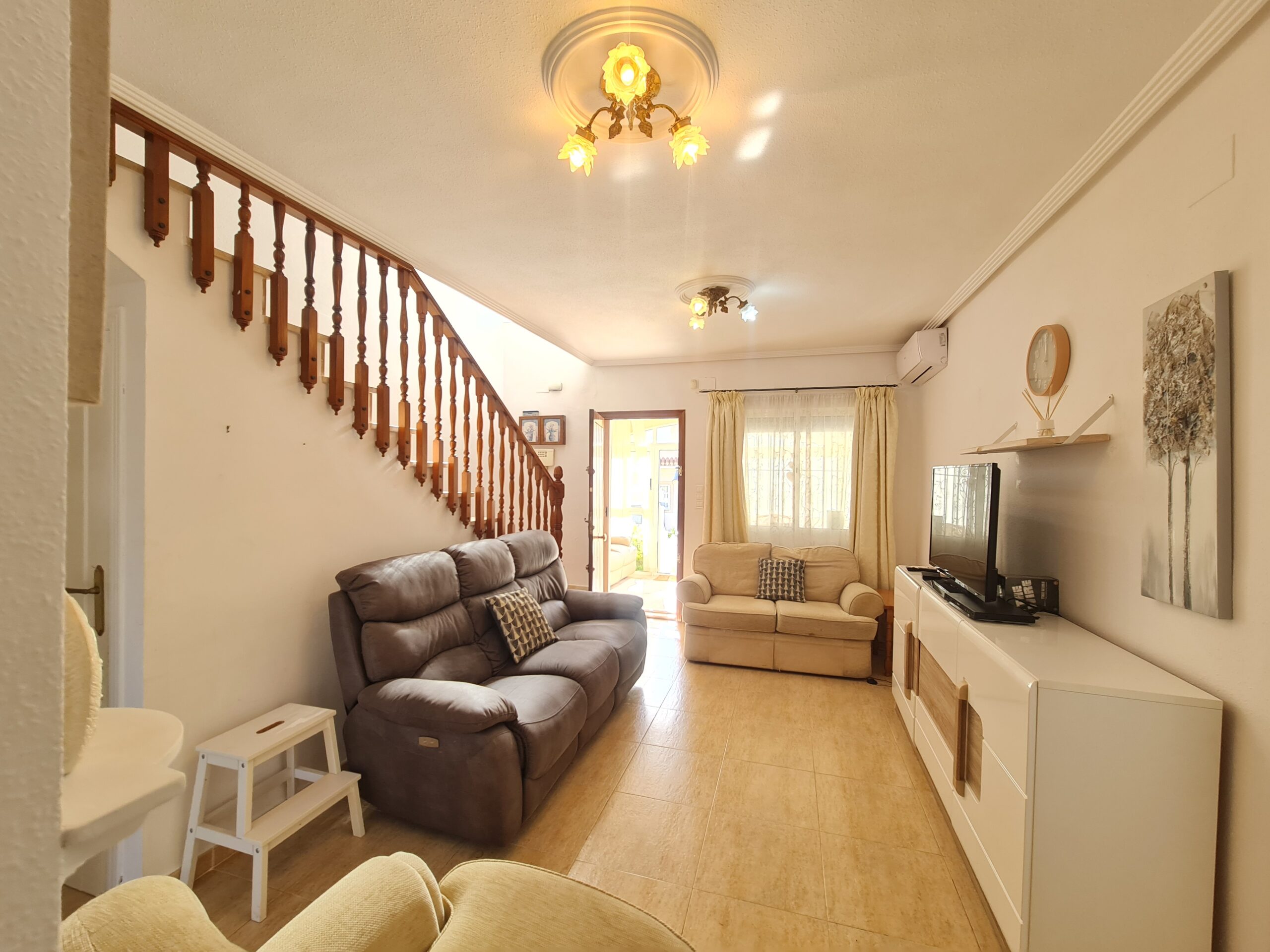 - Spectacular house with large outside space , private garage, private pool. House offer 2 bedrooms , 1 bathroom , living room and separate kitchen downstairs and 1 bedroom 1 bathroom upstairs. With a sunny terrace with a little sea views. La Fuente commercial center its not even 5 min drive. Also golf courses are just around the corner. Alicante airport 45 min drive. Sandy Beach only 6-7 min drive.: